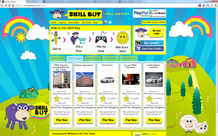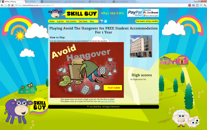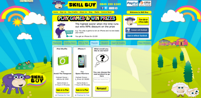 So on my first day, Alex told me the project I'd be working on was called Skill Buy, and proceeded to explain the concept. The idea was similar to an auction site that was popular at the time where you could bid on a product, but you paid for every bid – so if you saw an iPhone with a winning bid of 1p, you could bid 2p, but if you were outbid, you'd lost your 2p – eventually someone would win it at a bargain price at the expense of everyone who'd bid before them and the company would make a fortune. They're called penny auctions and you can read about them in this paper: Are online penny auctions a form of gambling? Anyway – the idea I'd been told about was similar, but instead of bidding, you'd play a game (a Flash or Unity game made by the game devs I was working with) – and it worked like an arcade game – the winner gets the prize. You'd buy credits, spend your credits playing games, and if you were the top scorer at the end of the game's countdown timer, you'd win the prize. Actually you'd win the prize at 99% discount because they seemed to think that got around gambling laws.